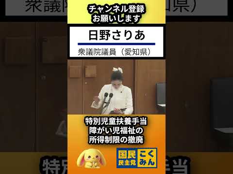 国民民主党 日野さりあ 衆議院議員 特別児童扶養手当、障害児福祉の所得制限の撤廃を主張 参議院厚生労働委員会 一般質疑