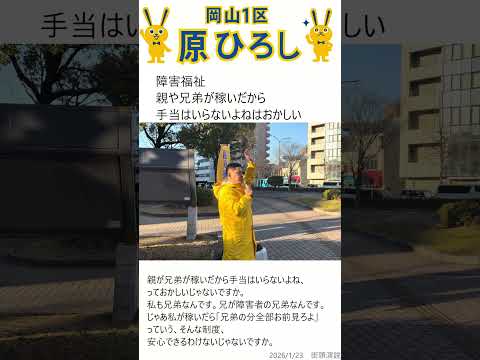 岡山1区 国民民主党 原ひろし 障害福祉 親や兄弟が稼いだから手当はいらないはおかしい