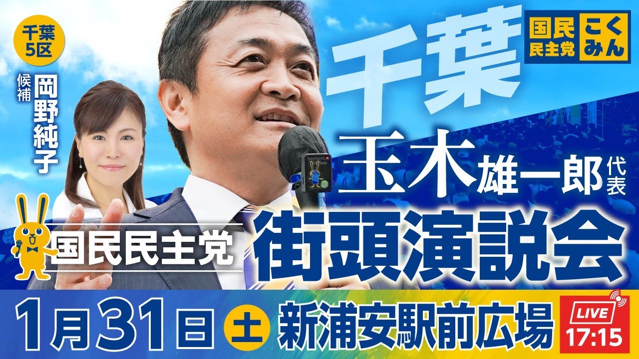 国民民主党街頭演説会 1月31日(土)17:15〜 @新浦安駅前広場 弁士:玉木雄一郎代表、岡野純子候補衆院選2026特設サイト:【ご意見・ご支援】クラウドファンディング:こくみんクラブ:切り抜き動画用素材:ht...