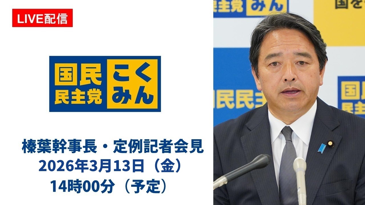 【LIVE配信】国民民主党・榛葉幹事長会見 2026年3月13日(金)14時00分(予定)