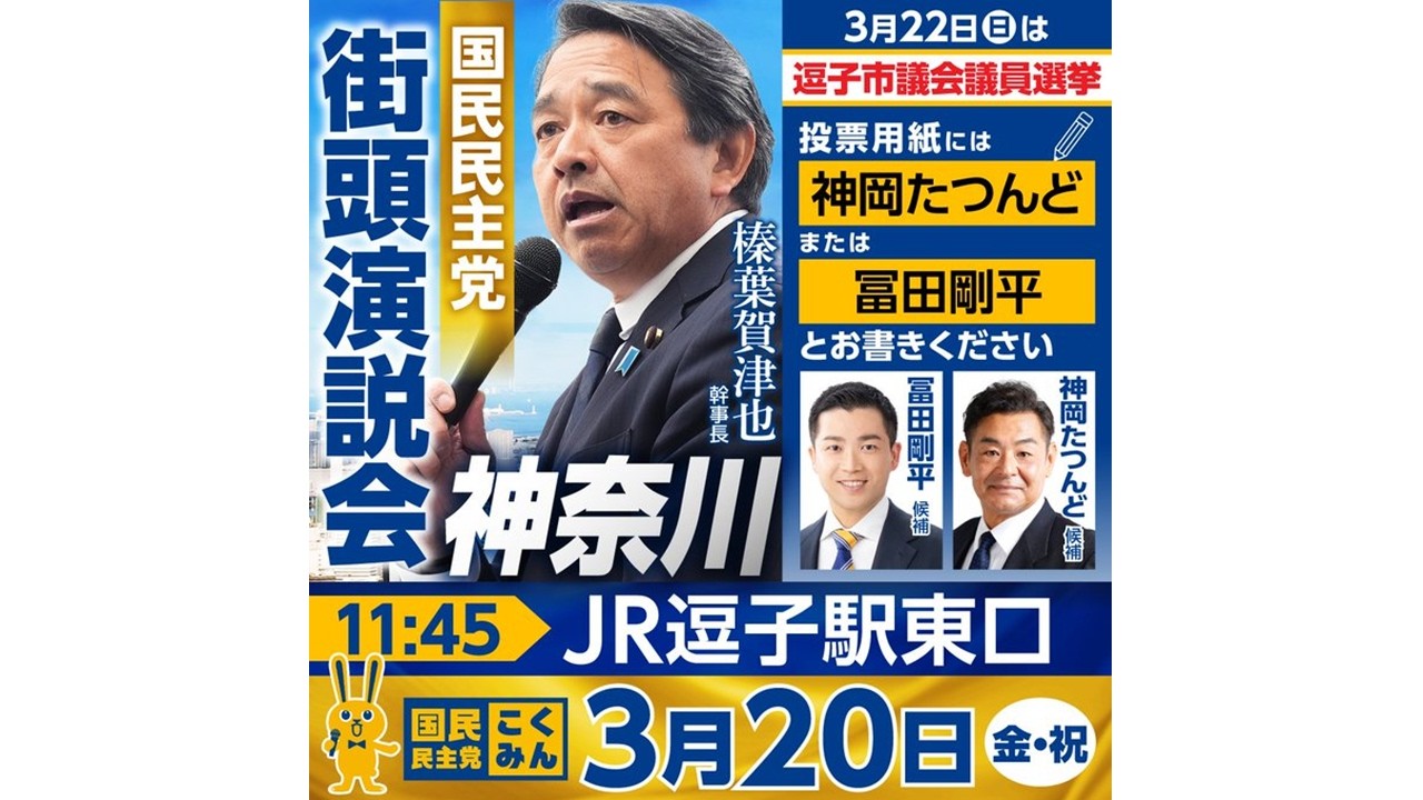 Live 逗子市議会議員選挙 街頭演説会 国民民主党 #榛葉賀津也 #神岡たつんど #冨田剛平 2026/3/20 11:45#冨田剛平#神岡たつんど