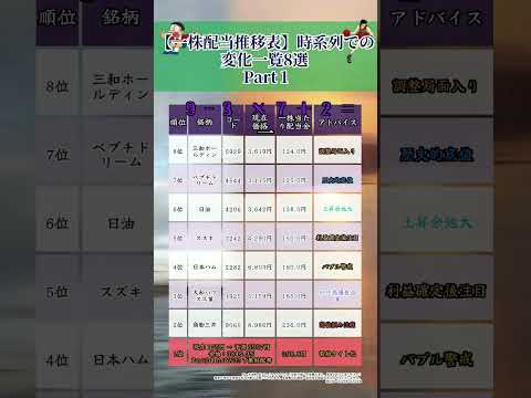 一株配当推移表時系列での 変化一覧8選 8位商船三井9065 現在価格8986円 一株当たり配当金236.0円 アドバイス注目銘柄 7位大和ハウス工業1925 現在価格5159円 一株当たり配当金165.0円 アドバイス注目銘柄 6位日本ハム2282 現在価格6803円 一株当たり配当金160.0円 アドバイス注目銘柄 5位スズキ7242 現在価格4290円 一株当たり配当金150.0円 アドバイス注目銘柄.mp4