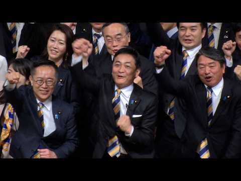玉木雄一郎代表はあいさつで「地方議員を倍増し、28年参院選で勝利を収め、党の交渉力を高めていく」と宣言。「高市政権が衆院選で大勝した今、正直しんどい時だ。今は根を張り、地力をつけていこう」と結束を呼び掛けた。【時事通信映像センター】